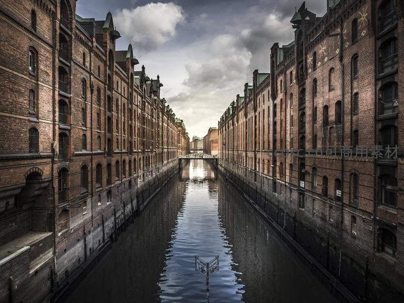 两岸红砖仓库沿河而立,水面平静如镜倒映建筑轮廓,云层低垂营造出复古静谧的欧洲港口氛围。