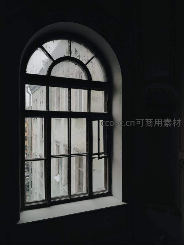 昏暗房间中的拱形窗景