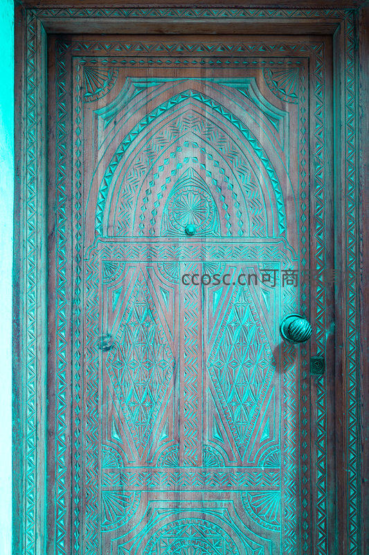 一扇精雕细琢的木质大门,通体覆盖青绿色漆面,繁复几何纹样与拱形设计彰显传统工艺魅力,门环点缀其间,古韵悠长。