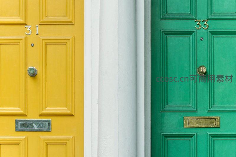 明亮的黄色与翠绿色门板形成强烈视觉冲击,白色立柱分隔空间,门牌号与金属配件点缀其间,展现现代建筑的几何与色彩艺术。