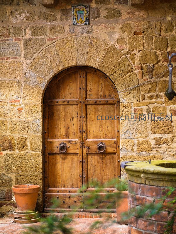 古朴石墙拱门木门静谧庭院