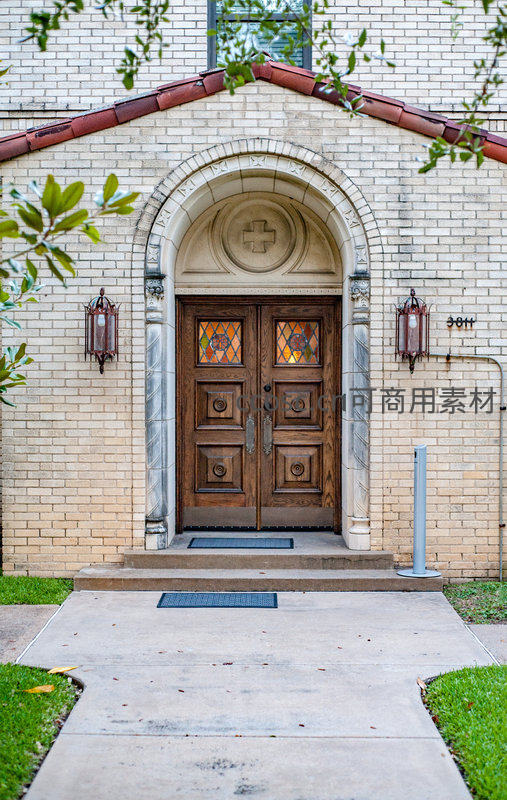 一座浅色砖墙教堂正门,拱形门楣内嵌浮雕十字架,深棕色木门配以彩色玻璃窗格,两侧悬挂复古壁灯,前方铺有整洁步道,庄严肃穆中透着温暖神圣感。