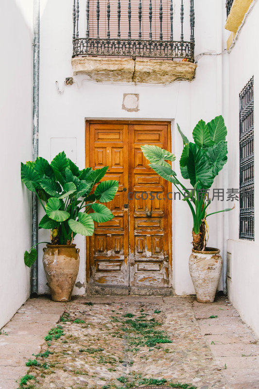 一条狭窄的白色粉刷巷道尽头是一扇古旧木质双开门,门两侧各置一个大型陶土花盆,栽种着宽大绿叶植物,地面青苔点缀,营造出清新、宁静的地中海庭院风格。
