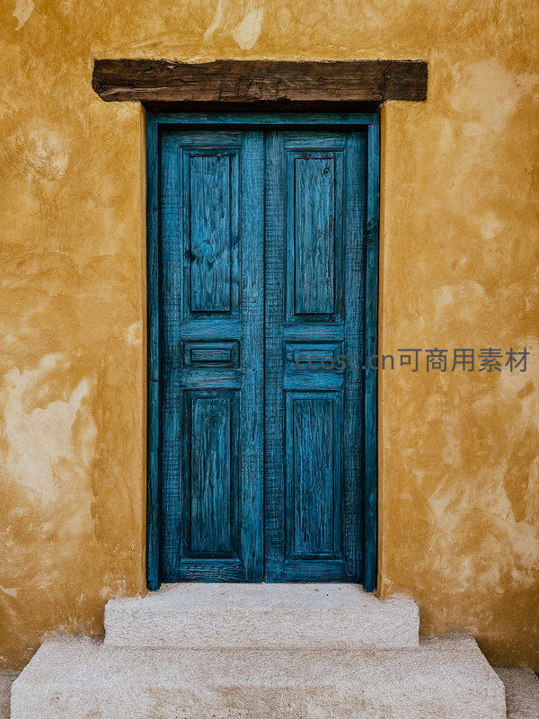 一扇深蓝色的木质双开门镶嵌在土黄色的粗糙墙面上,门楣是粗犷的原木,门前有两层石阶,整体散发着浓厚的历史感与宁静氛围。