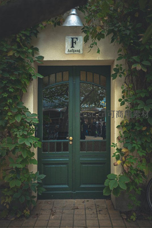 一扇深绿色的玻璃门被茂密的绿色藤蔓半包围,门楣上挂着“F Aufgang”的德语标牌,透过玻璃可窥见内部人影,营造出幽静而神秘的庭院氛围。