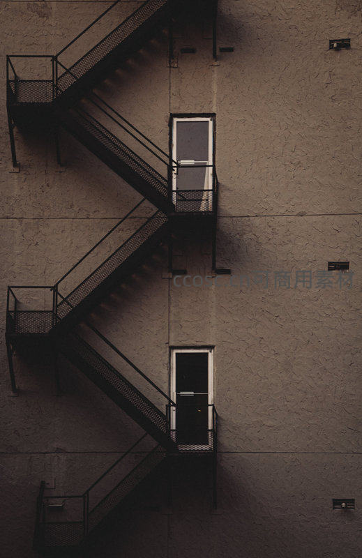 一栋老式建筑外墙上,黑色的金属消防楼梯蜿蜒而下,与米色粗糙墙面形成强烈对比。窗户作为视觉焦点,整体构图充满工业美学与都市的冷峻感。