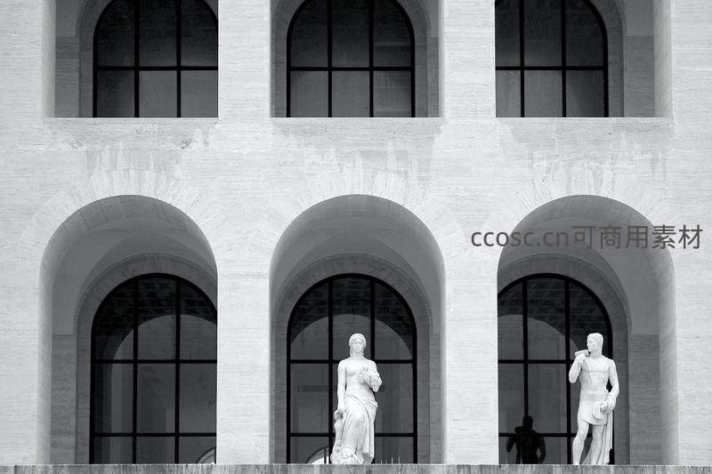 在简洁的黑白调中,两尊古典风格的大理石雕像静静伫立于宏伟的拱形窗廊前,线条分明的建筑结构与人物形态形成强烈对比,充满艺术张力。