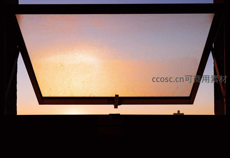 透过打开的天窗,夕阳余晖洒满天空,橙黄色光芒穿透磨砂玻璃,室内轮廓呈剪影状,营造出温暖、宁静且充满诗意的黄昏时刻。