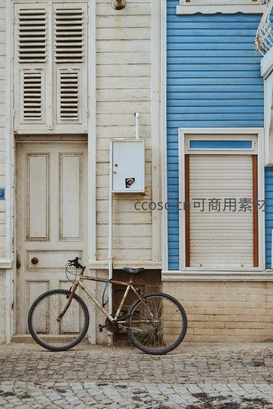 街角老自行车与彩色木屋