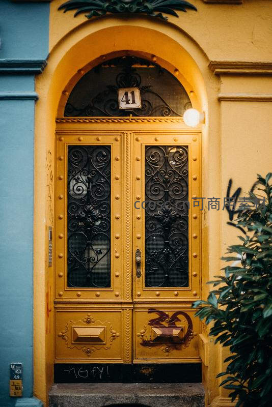 一扇闪耀着温暖光泽的金色双开门,其上镶嵌着繁复精美的黑色锻铁花纹,门楣标有“41”号牌。整体设计充满欧式古典奢华气息。