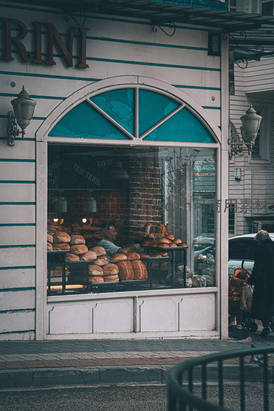 一家街角面包店的拱形橱窗内,金黄诱人的面包堆叠陈列,在温暖灯光的映衬下散发着诱人香气,行人从旁经过,充满浓郁的生活气息。