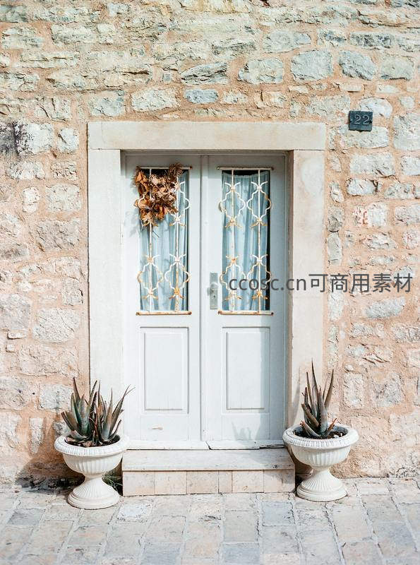 一座由天然石材砌成的古老墙面,中央是一扇淡蓝色木门,门上饰有金色铁艺花纹。门前台阶两侧摆放着白色花盆中的多肉植物,整体氛围宁静而富有生活气息。