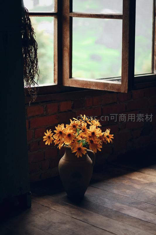 一束金黄色雏菊插在古朴陶罐中,置于斑驳砖墙与木窗旁,柔和阳光斜射入室,营造出温暖宁静的田园居家氛围。