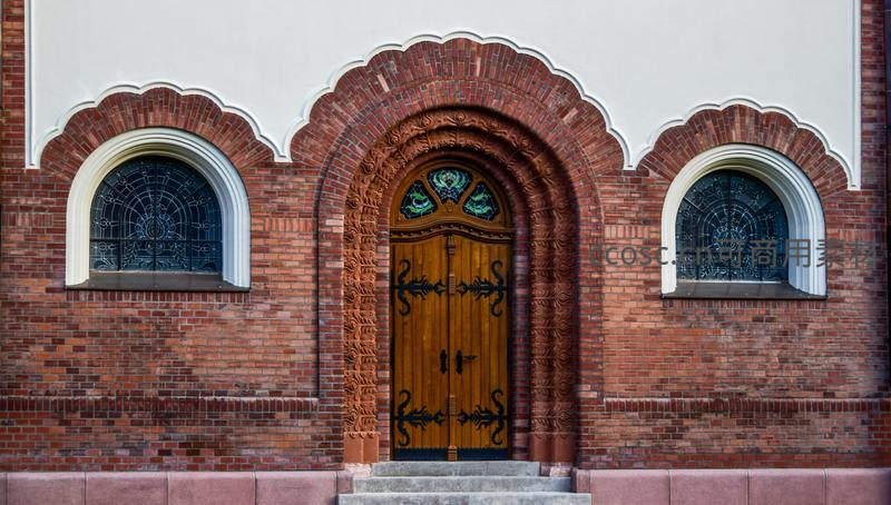 红砖拱门教堂入口,雕花木门与彩窗