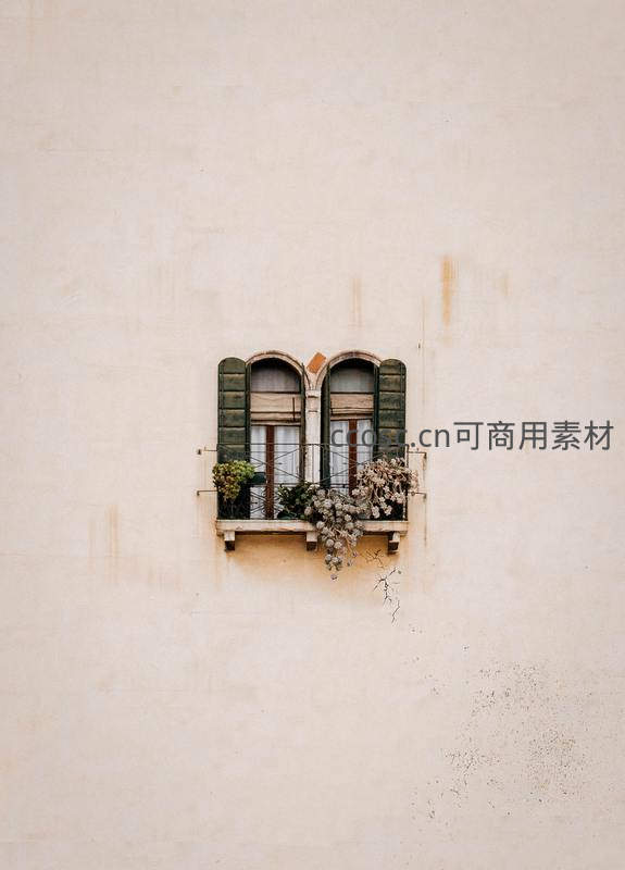 浅色墙面上一对绿色拱形窗,窗下花箱内干花垂落,整体构图简洁对称,散发出地中海式慵懒与岁月沉淀的优雅气息。