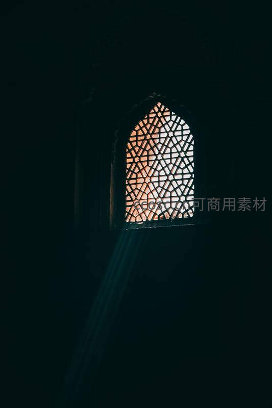 一扇精美的几何图案窗棂在黑暗中透出温暖的光线,光束如圣洁之柱洒落,营造出宁静而神秘的氛围,展现建筑与光影的完美融合。