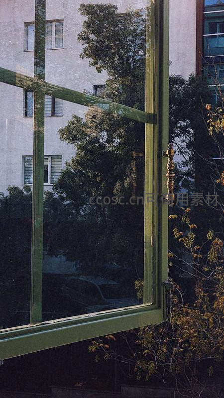 一扇开启的绿色木质窗框,玻璃中清晰映出对面楼宇与茂密树冠,窗外枯枝点缀,营造静谧而富有层次的城市生活氛围。