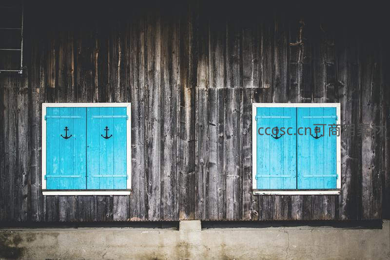 两扇明亮的蓝色百叶窗镶嵌在深色木质外墙之上,每扇窗上都装饰着黑色船锚图案,简约而富有海洋风情,展现了一种质朴又充满故事感的建筑美学。