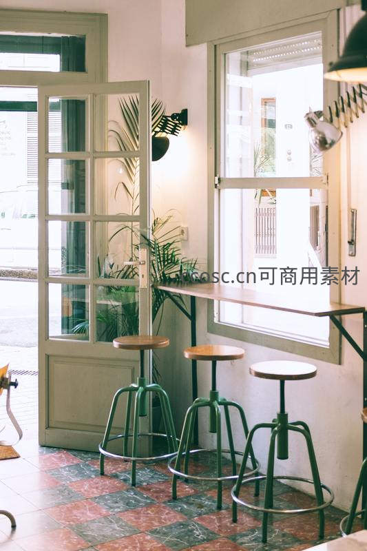 阳光透过大窗户洒进温馨的咖啡馆,绿色金属高脚凳整齐排列在吧台前,旁边绿植摇曳,彩色地砖与复古门窗共同构成一幅惬意悠闲的午后场景。