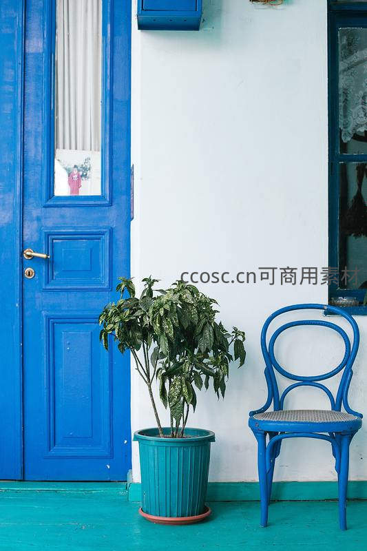 一扇鲜艳的蓝色木门旁,摆放着一盆绿意盎然的植物和一把同色系的复古藤编椅,强烈的色彩对比与简洁的构图,展现出充满艺术感的居家或庭院一角。