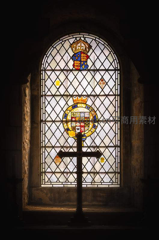 一扇高大的拱形彩绘玻璃窗,在昏暗的室内透出柔和光芒,窗上绘有皇家徽章和王冠,前方矗立着一个黑色十字架,充满庄严神圣感。