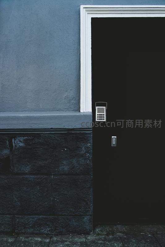 一扇纯黑色的现代大门嵌入灰蓝色的质感墙面,门旁装有简洁的对讲系统,整体构图干净利落,线条分明,营造出一种低调、冷静且富有设计感的都市氛围。