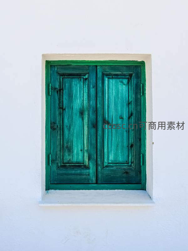 一扇带有岁月痕迹的复古绿色木窗嵌在洁白的墙面上,简洁而富有艺术感,传递出一种静谧、纯粹的视觉享受。