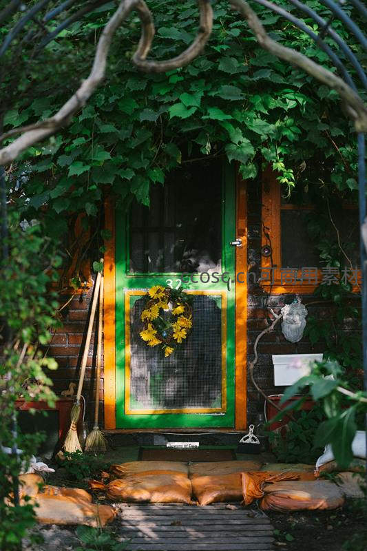 绿藤缠绕的田园小屋门扉