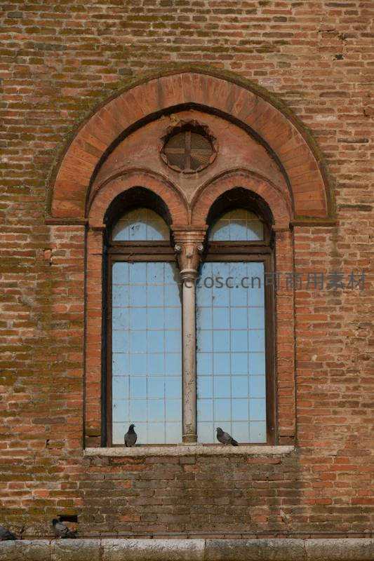 古老的红砖墙面上,一扇精美的双拱形窗户在阳光下熠熠生辉,两只鸽子悠闲地停驻在窗台上,为这座充满历史感的建筑增添了一抹生动的自然气息。