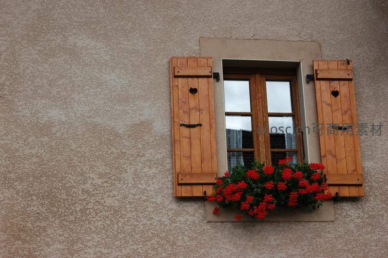 木制百叶窗与红花相映,温馨欧式窗台风景
