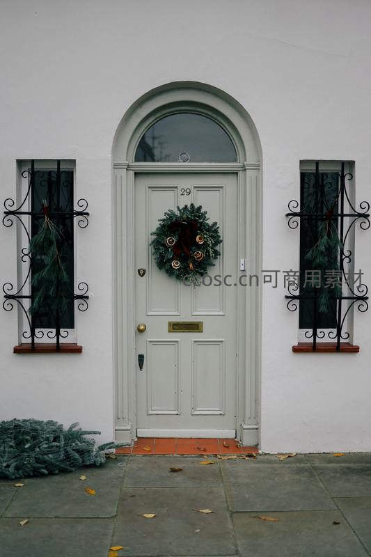 白色门廊挂满圣诞花环,节日氛围浓厚