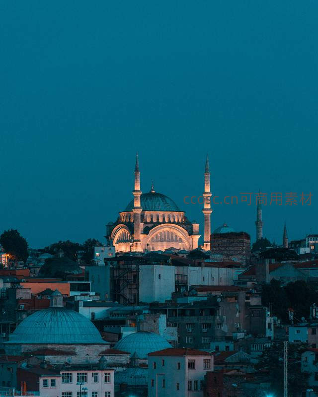 深蓝夜幕中,清真寺被温暖灯光点亮,穹顶与尖塔轮廓清晰,俯瞰密集屋舍,城市沉入温柔静谧之夜。