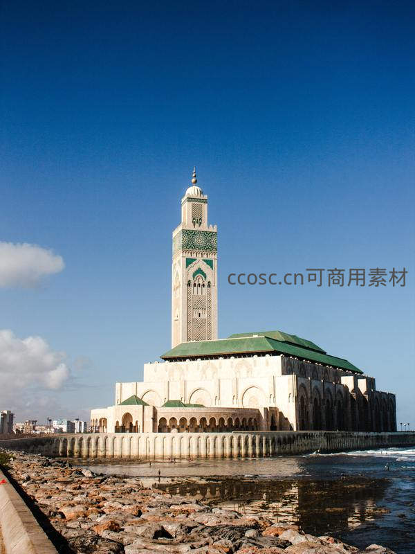 宏伟的哈桑二世清真寺部分建于海面之上,高耸的宣礼塔直插云霄,在蔚蓝天空和碧海的映衬下,尽显其壮丽与神圣。