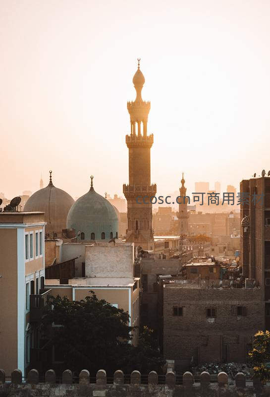 晨曦中的清真寺尖塔与城市剪影