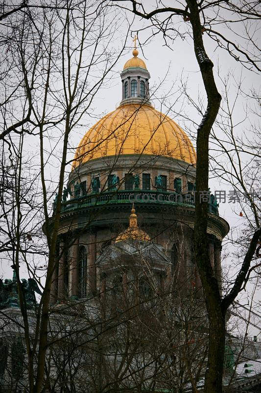 金色穹顶教堂透过枯树枝的冬日景象