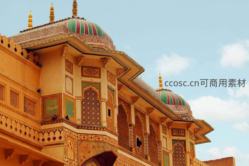 印度宫殿彩绘穹顶在蓝天映衬下绚丽斑斓