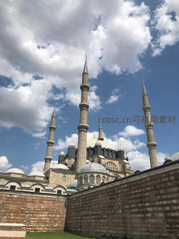 蓝天白云下的壮丽清真寺尖塔