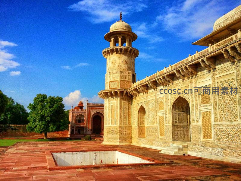 在湛蓝天空下,泰姬陵旁的白色大理石亭阁熠熠生辉,其精美的镂空雕花与对称结构体现了莫卧儿王朝的建筑美学与精湛工艺。
