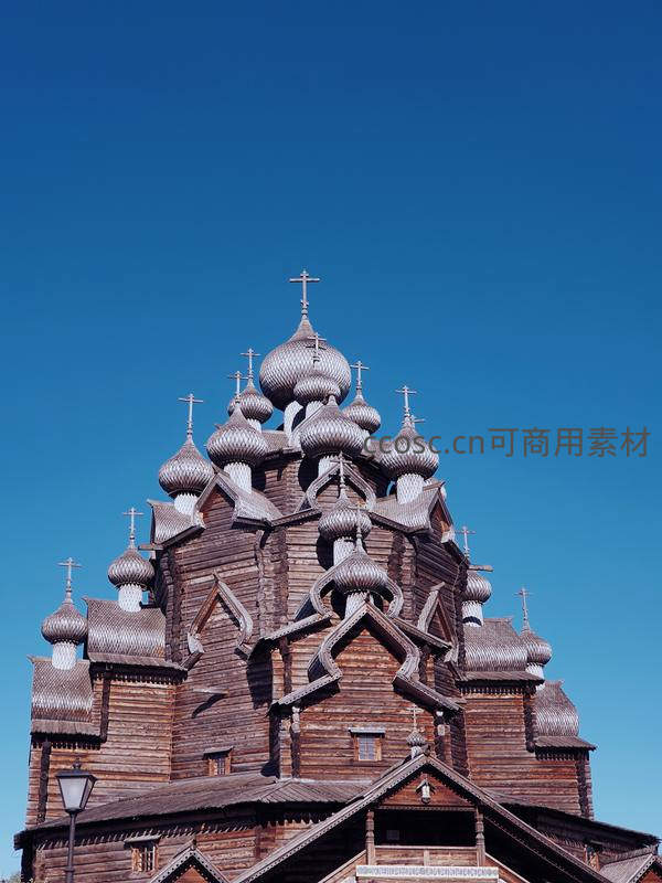 一座宏伟的木质东正教教堂矗立于纯净的蔚蓝天空之下,其标志性的多层洋葱形穹顶和顶端的十字架,在阳光下显得庄严肃穆,充满浓郁的异域风情。