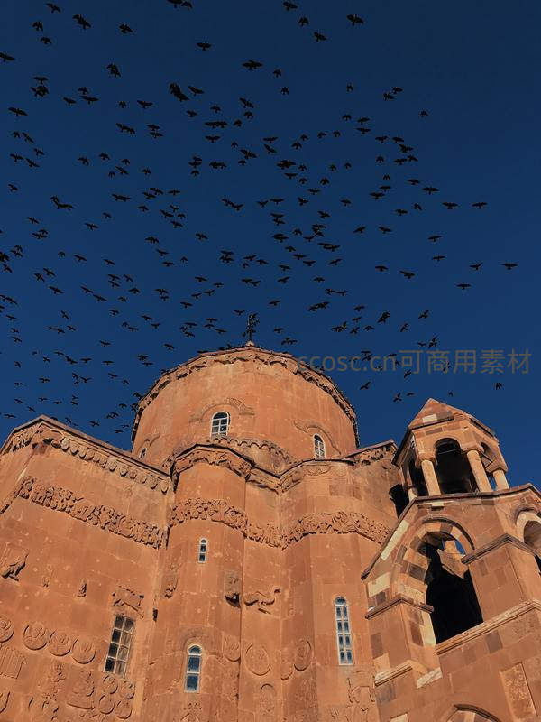 古老的红砖教堂在湛蓝天空下矗立,成群飞鸟掠过穹顶,形成动与静、自然与人文交织的震撼画面。