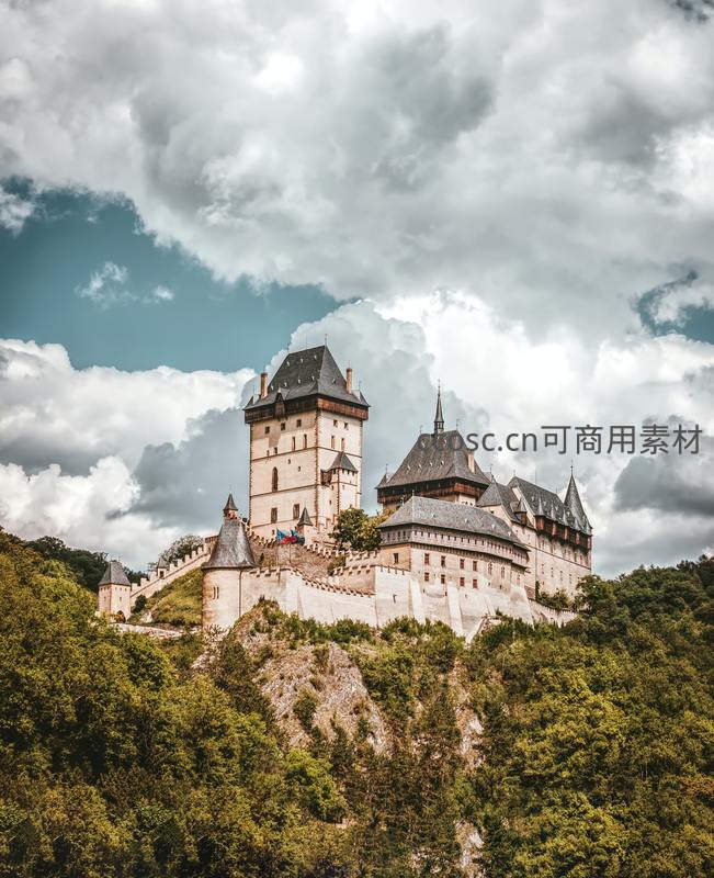 一座宏伟的中世纪城堡坐落在郁郁葱葱的山顶,被翻滚的白云环绕,展现出庄严而神秘的历史气息。