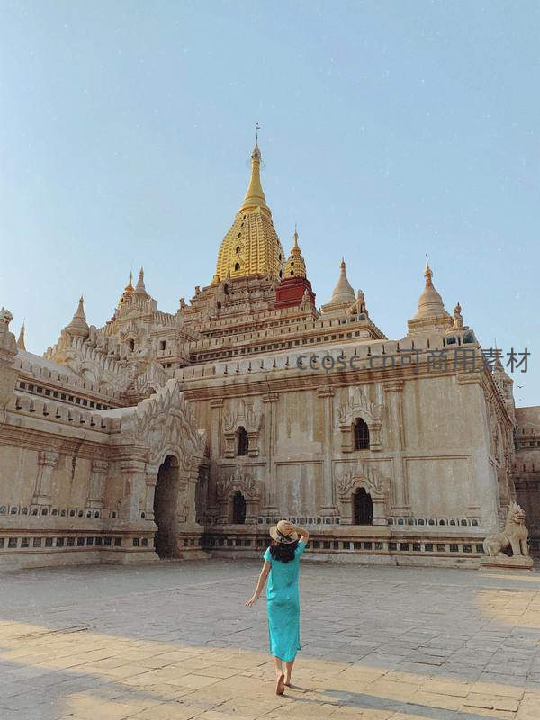 缅甸佛塔前,女子漫步于历史光影中