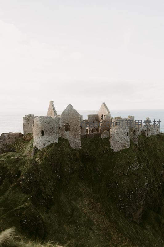 一座古老的石砌城堡矗立在陡峭的绿色悬崖之巅,背景是辽阔的海洋与灰白天空,展现出历史沧桑与自然雄浑的壮丽景象。