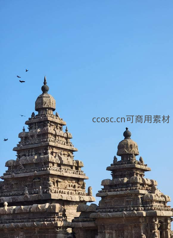印度神庙塔顶,飞鸟掠过蔚蓝晴空