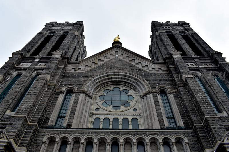 教堂正面采用厚重石料建造,中央巨大的玫瑰窗设计精美,两侧高耸的双塔直指苍穹,顶部金色圣像在灰白天空下熠熠生辉,整体散发出神圣而肃穆的宗教氛围。