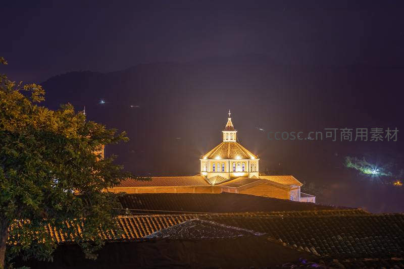 一座小教堂在夜色笼罩的山顶被温暖的灯光点亮,其金色圆顶在黑暗中格外醒目,下方是沉睡的村落屋顶与一棵孤树,氛围静谧而安详。
