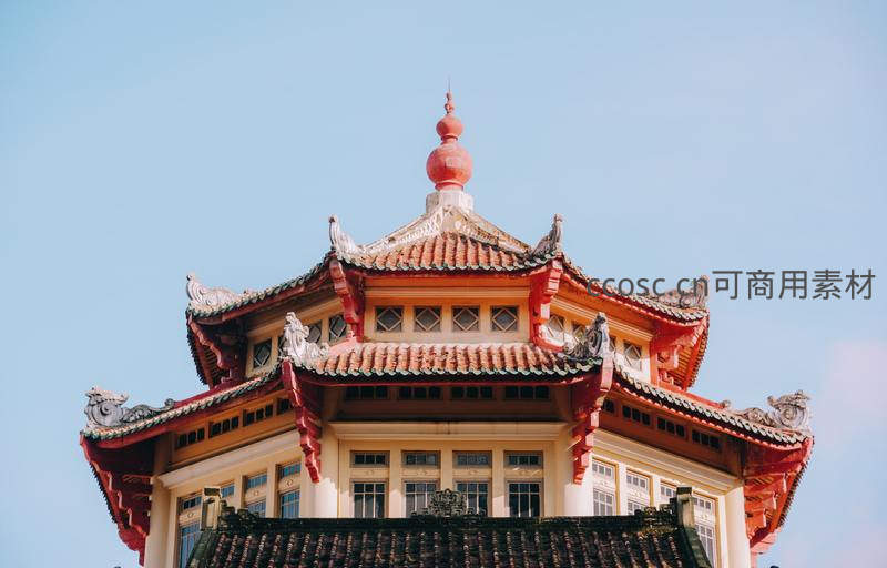 传统中式塔楼在蓝天映衬下尽显古韵,飞檐翘角、雕梁画栋,红瓦与白墙相映成趣,展现出东方建筑的精致与庄重。