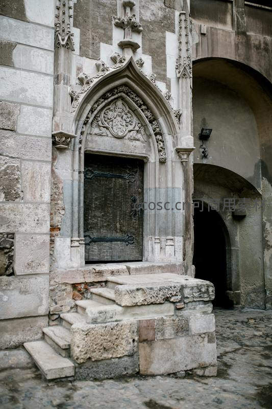 斑驳的石墙与精美的哥特式拱门相映成趣,厚重的雕花木门诉说着岁月的故事,台阶上的风化痕迹见证着时光流转。