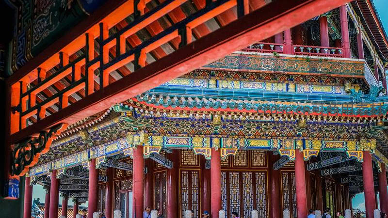 红柱彩绘古建筑细节特写