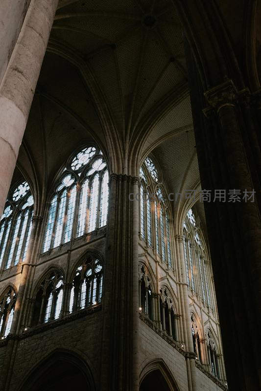 哥特教堂高耸穹顶,彩窗透光神圣